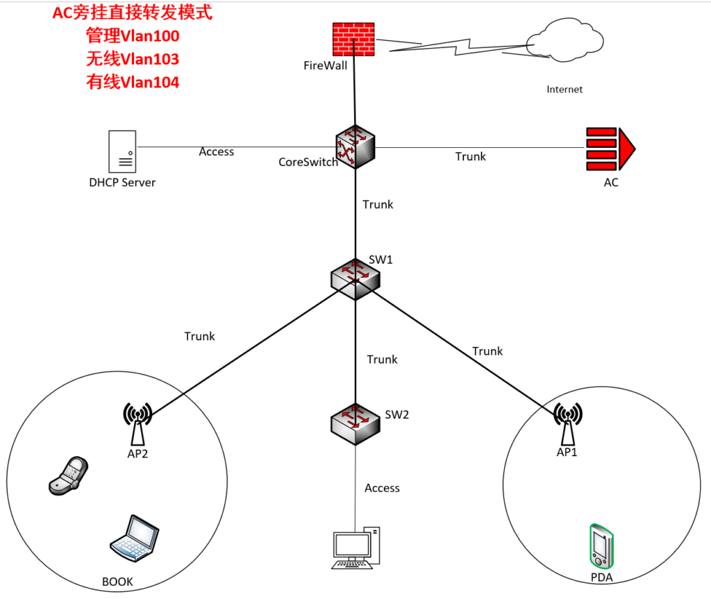 解析:交换机收到AP的数据帧打上100的tag发送,把带上100tag的数据帧去掉然后发给AP