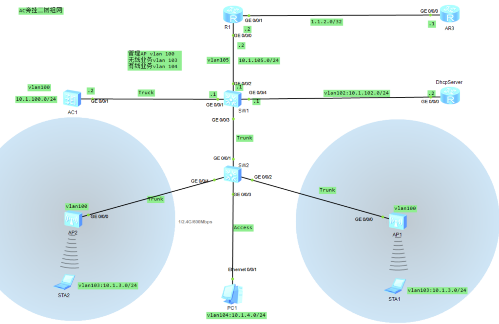 [AC1]capwap source interface Vlanif 100 //AC的接口源地址为VLAN100
