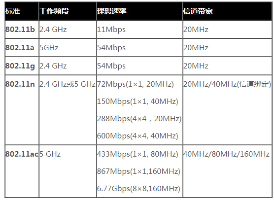 目前的无线区域网络以IEEE 802.11标准为基础,称为Wi-Fi网络。 802.11a/b/g/n/ac