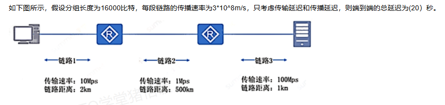 这里要特别注意的是题干直接给出了链路的传播速率,因此不要使用我们平常记住的信号传输速度的常数。 数据传输时间 = 信号的传输时延 + 传播时延;由于在原目的节点中间存在有 2 个路由器,每个路由器都会使用存储转发的方式转发数据,因此在这三段链路上,数据会被发送三次。由于三段链路的总距离为 503km, 因此这三段链路的传播延迟是:503*10^3m/3*10^8m/s=167.67*10^(-5) s=0.00168s 而三次传输延迟因为其路速率不同,所以次传输的时也各不相同,可以由数长度 / 路速度计算得出,三次传输延时的时间 是:16000b/10*10^6b/s+16000b/1*10^6b/s+16000b/100*10^6b/s=0.01776s