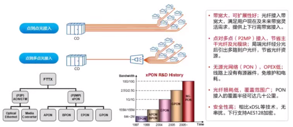 PON :Passive Optical Network 无源光网络 分为 (P2P、P2MP)接入方式。现在主要有Epon ,Gopn