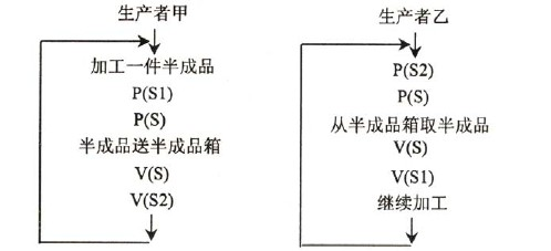 这里成品箱看作控制信号量(互斥信息号量)其初始值为1 ,s1,s2的初值分别为n 和0 。