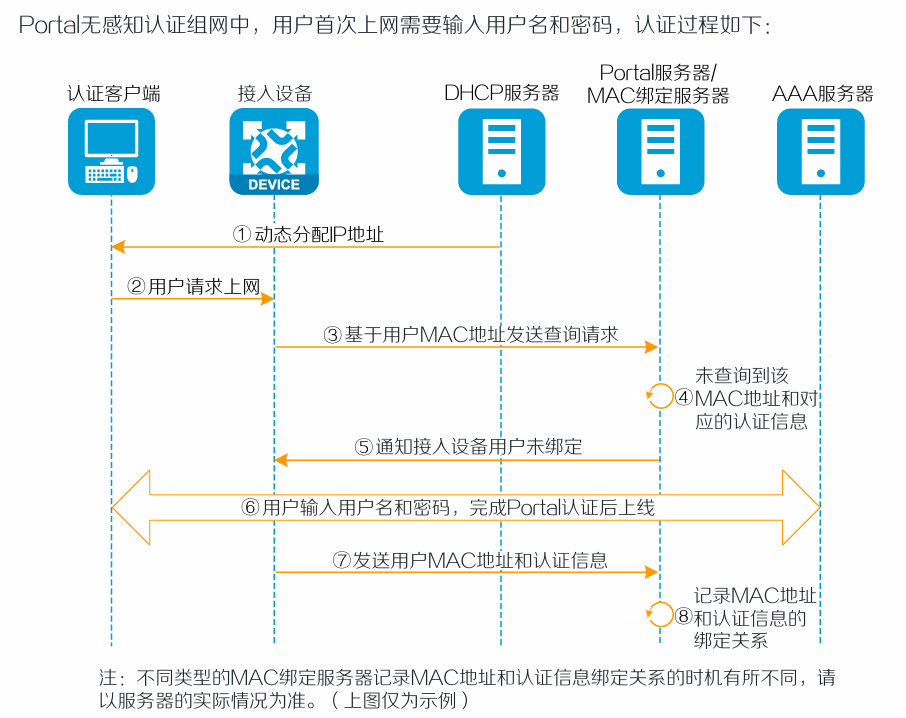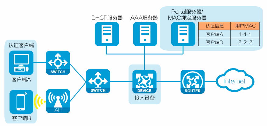 - MAC绑定服务器:用于记录客户端认证信息和客户端MAC地址绑定关系的服务器。MAC绑定