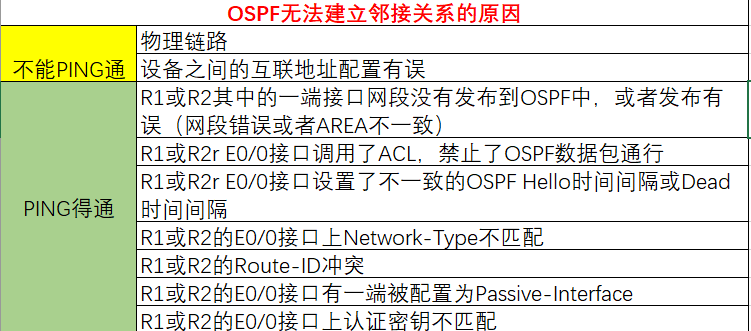 - R1或R2r E0/0接口设置了不一致的OSPF Hello时间间隔或Dead时间间隔