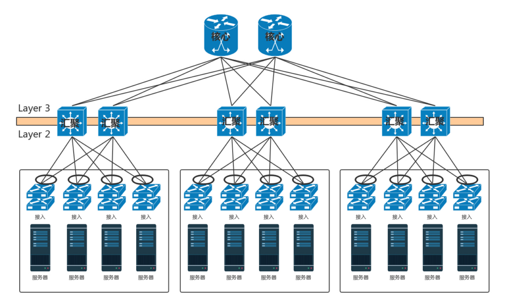 大二层:但是随着数据中心里面的机器越来越多,尤其是有了云计算、大数据,集群规模非常大,而且都要求在一个二层网络里面。这就需要二层互连从汇聚层上升为核心层,也即在核心以下,全部是二层互连,全部在一个广播域里面,这就是常说的大二层。