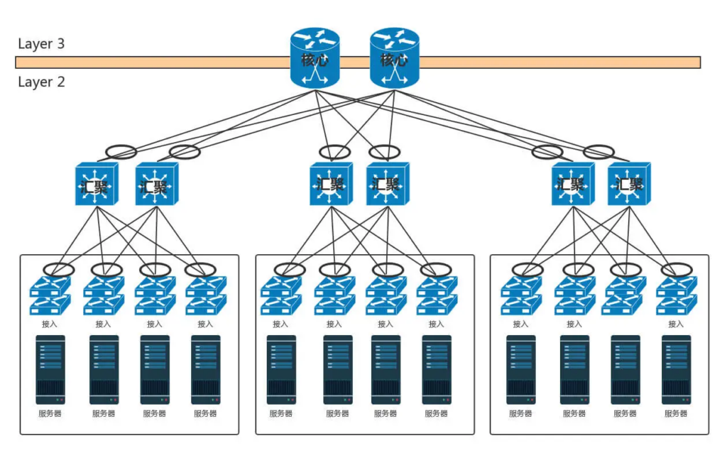 南北流量:这是一个典型的三层网络结构。这里的三层不是指 IP 层,而是指接入层、汇聚层、核心层三层。这种模式非常有利于外部流量请求到内部应用。这个类型的流量,是从外到内或者从内到外,对应到上面那张图里,就是从上到下,从下到上,上北下南,所以称为南北流量。