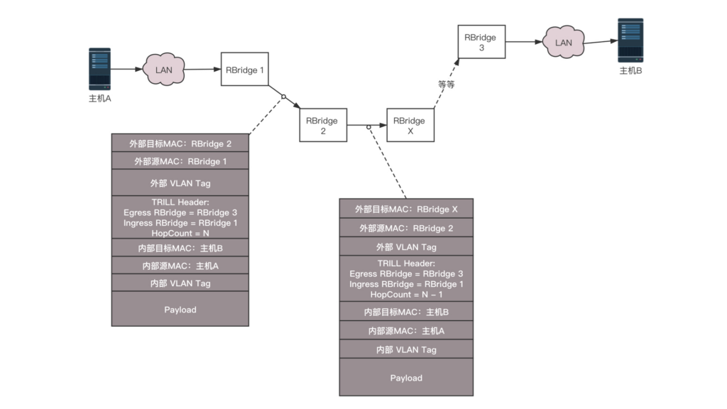 RBridge:运行 TRILL 协议的交换机称为 RBridge,是具有路由转发特性的网桥设备,只不过这个路由是根据 MAC 地址来的,不是根据 IP 来的。