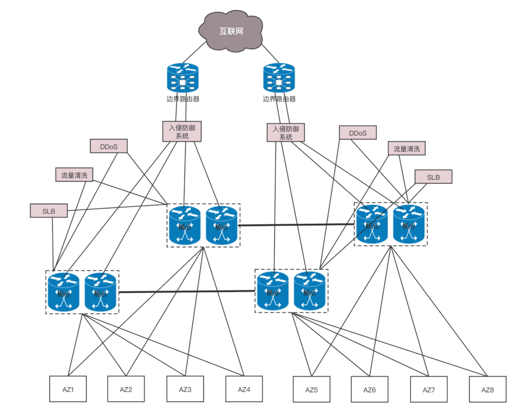典型的数据中心网络架构:在核心交换上面,往往会挂一些安全设备,例如入侵检测、DDoS 防护等等。这是整个数据中心的屏障,防止来自外来的攻击。