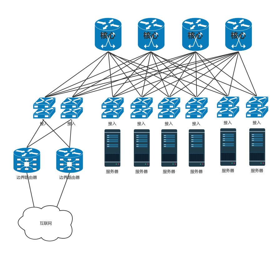 Core Switch 核心交换机:当节点数目再多的时候,一个可用区放不下,需要将多个可用区连在一起,连接多个可用区的交换机称为核心交换机。核心交换机吞吐量更大,高可用要求更高,肯定需要堆叠,但是往往仅仅堆叠,不足以满足吞吐量,因而还是需要部署多组核心交换机。核心和汇聚交换机之间为了高可用,也是全互连模式的。