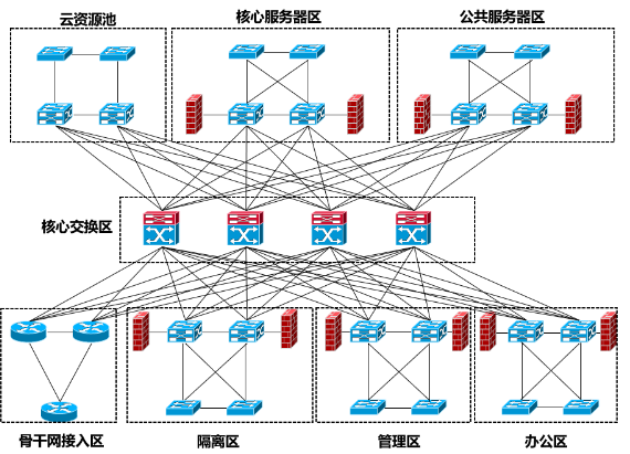 相同安全级别的业务无需经过防火墙(单一等保),也就是汇聚下方的所有业务可以直接互相访问。