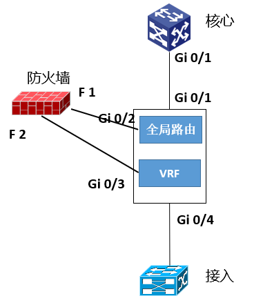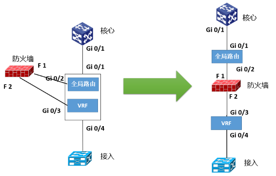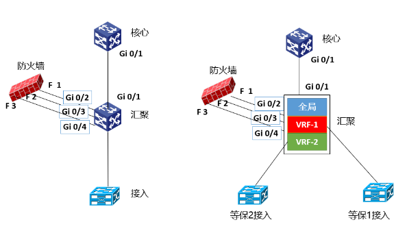 将防火墙放置在全局路由和VRF 之间,一个“单一等保”级别的,化旁路为串联的流量图就完成了