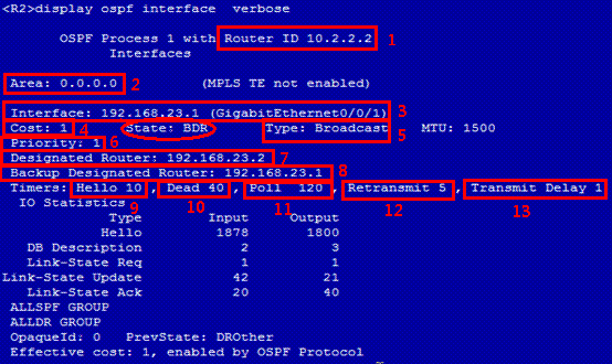 - 12)Retransmit:接口没有收到来自对端“LSA已经收到”的确认报文,需要重传LSA的等待时间。