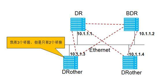 这也就解答了第二篇里面广播链路/NBMA链路的一些疑问。在广播链路/NBMA链路里,因为DROther之间不需要交换LSA信息,所以建立的就是邻居关系。而DR与BDR之间,DR/BDR与DROther之间需要交互LSA信息,所以建立的是邻接关系。如上图所示。