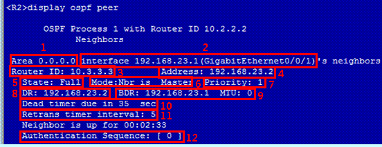 - 7)DesignatedRouter:接口所在广播网络/NBMA网络上的指定设备,即DR。一般用连接这个广播网络/NBMA网络的接口地址表示。比如192.168.23.0/24这个广播网络/NBMA网络的DR是相连接口地址为192.168.3.2的设备。