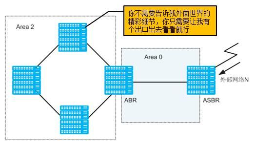 对于Area 2中的路由器来说,其实区域间的明细路由它也没必要都了解,仅保留一个出口让Area 2中的路由器的数据包能够出去就足够了。这就产生了OSPF的第二种类型的特殊区域――Totally Stub区域,也叫完全Stub区域。配置了Totally Stub区域以后,既不允许自治系统外部的路由在区域内传播,也不允许区域间路由在区域内传播。这样就能达到进一步减少区域内LSA数量的目的。