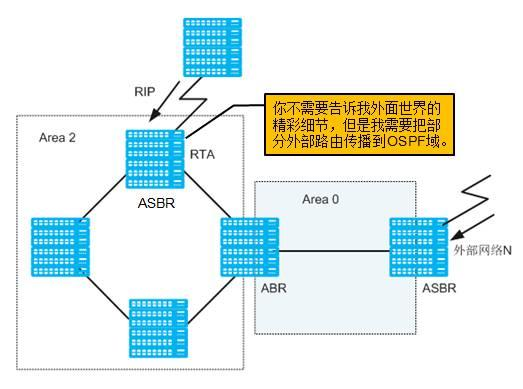 假设Area2原来作为一个Stub区域运行,但是某一天有个外部网络需要通过Area2接入到这个OSPF网络。也就是需要将自治域外部路由引入并传播到整个OSPF自治域中,此时可以在RTA上将外部路由注入到OSPF域,但是这种配置将使RTA成为ASBR,因此,Area2也就不是Stub区域了。 针对这种场景,OSPF定义了NSSA区域(Not-So-Stubby-Area NSSA) ,为了容易记忆,大家可以把它叫做“不那么Stub区域”,意思是在Stub区域的基础上做了一定的变通(允许引入外部路由了),所以就变得“不那么Stub”了。类似的,如果想进一步减少LSA数量,可以配置成Totally NSSA区域。