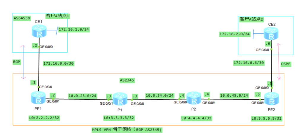 P、PE之间配置OSPF,实现骨干网的IP连通性。