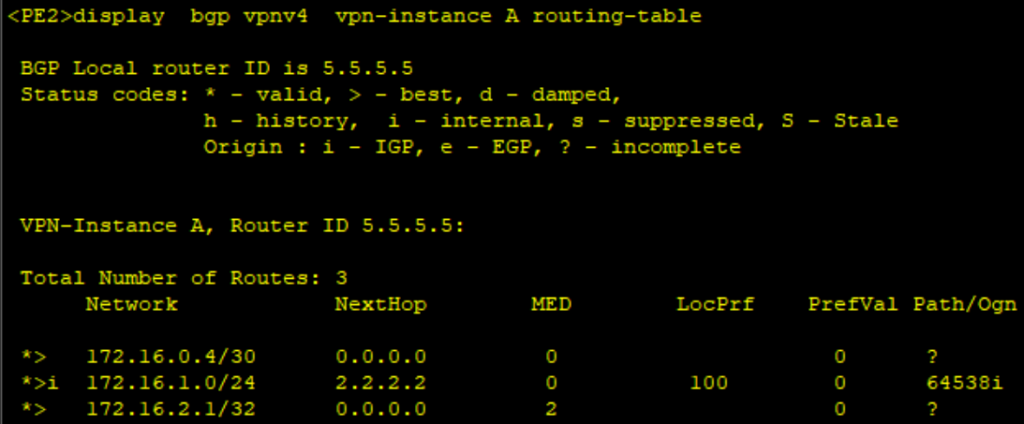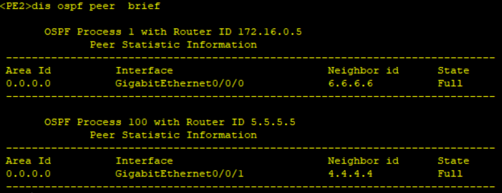 PE2>dis current-configuration configuration ospf [V200R003C00] #ospf 1 vpn-instance A // 创建了ospf 为1 的进程绑定了vpn-instance A import-route bgp area 0.0.0.0 network 172.16.0.4 0.0.0.3 # ospf 100 router-id 5.5.5.5 area 0.0.0.0 network 5.5.5.5 0.0.0.0 network 10.0.45.0 0.0.0.255