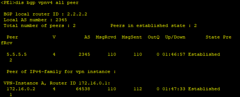 dis current-configuration configuration bgp [V200R003C00] # bgp 2345 router-id 2.2.2.2 undo default ipv4-unicast peer 5.5.5.5 as-number 2345 peer 5.5.5.5 connect-interface LoopBack0 # ipv4-family unicast undo synchronization undo peer 5.5.5.5 enable # ipv4-family vpnv4 policy vpn-target peer 5.5.5.5 enable #ipv4-family vpn-instance A router-id 172.16.0.1 peer 172.16.0.2 as-number 64538 # return
