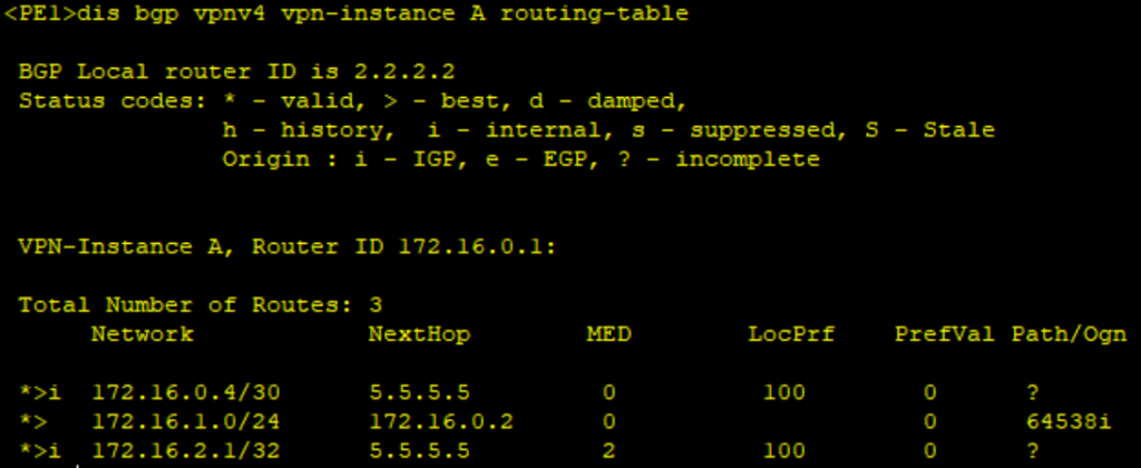 dis current-configuration configuration bgp [V200R003C00] # bgp 2345 router-id 2.2.2.2 undo default ipv4-unicast peer 5.5.5.5 as-number 2345 peer 5.5.5.5 connect-interface LoopBack0 # ipv4-family unicast undo synchronization undo peer 5.5.5.5 enable # ipv4-family vpnv4 policy vpn-target peer 5.5.5.5 enable #ipv4-family vpn-instance A // PE 和CE 通过Ebgp交互VPNv4路由。 router-id 172.16.0.1 peer 172.16.0.2 as-number 64538 # return