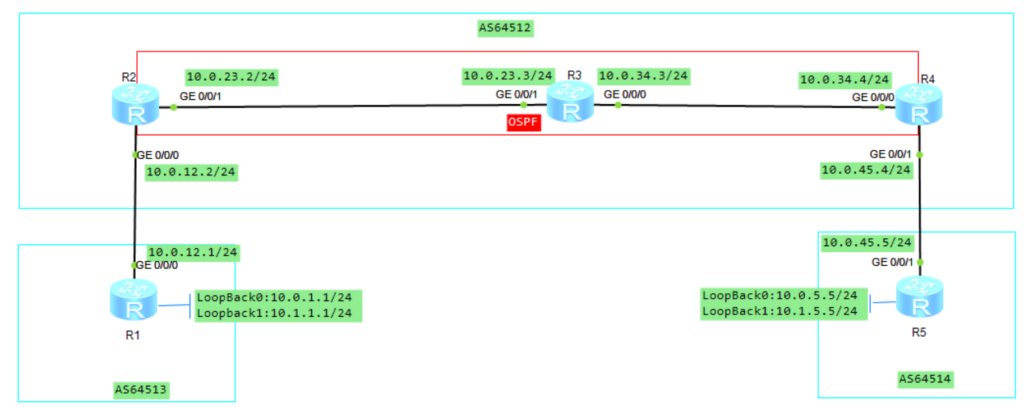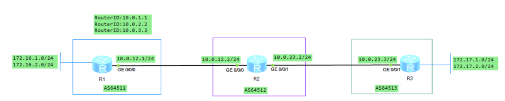 1、在R1上使用import 发布172.16.1.0/24 、 172.16.2.0/24 路由并自动汇总,在R3上使用import-route 命令 发布172.17.1.0/24 、172.17.2.0/24 路由;在R2上执行手动汇总,分辨如果不手动汇总情况下观察各BGP 路由表的as-path 属性。