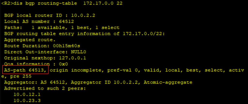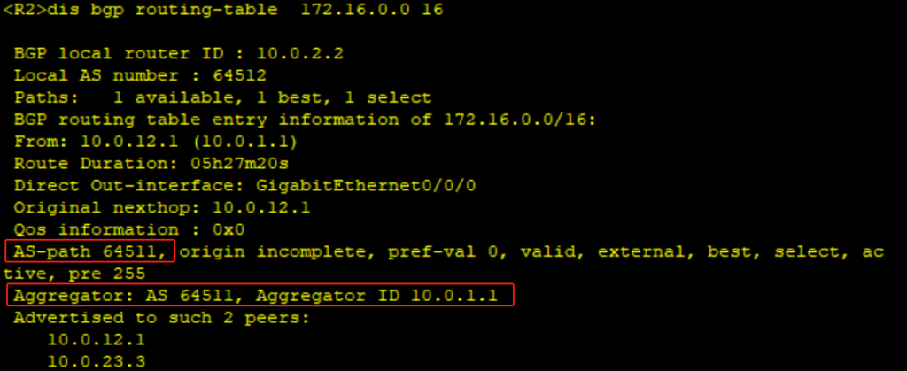 该路由的路径属性中存在Aggregator属性,其中携带了汇总路由生成设备所属的AS号以及其RouterID