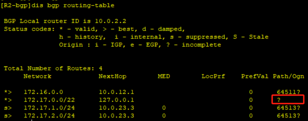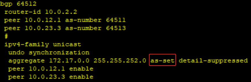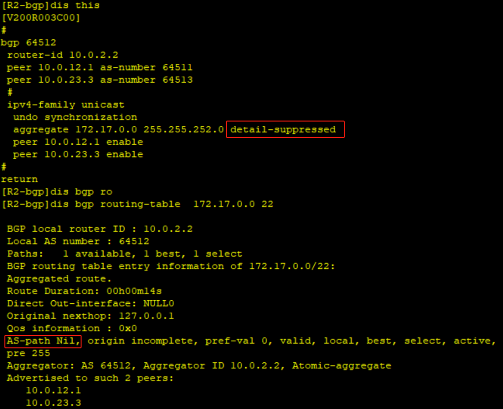 aggregate 172.17.0.0 255.255.252.0 as-set detail-suppressed //注意这里是对R3发布的172.17.1.0 、172.17.2.0 汇总成 172.17.0.0/22 并抑制明细路由的对外通告,如果不加as-set那么R2学习的BGP路由表中as-path 会为空。