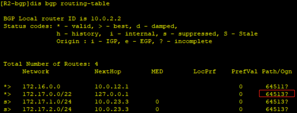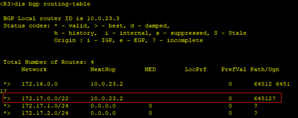 R3收到关于 172.17.0.0/22 的通行之后,在AS_Path 中看到自身的AS号(64513)将会忽略该路由的通告。此时R3的BGP路由表无法看到汇总路由172.17.0.0/22 ,因此通过在手动路由汇总的配置中使用as-set 关键字顺利地规避了路由环路的产生。