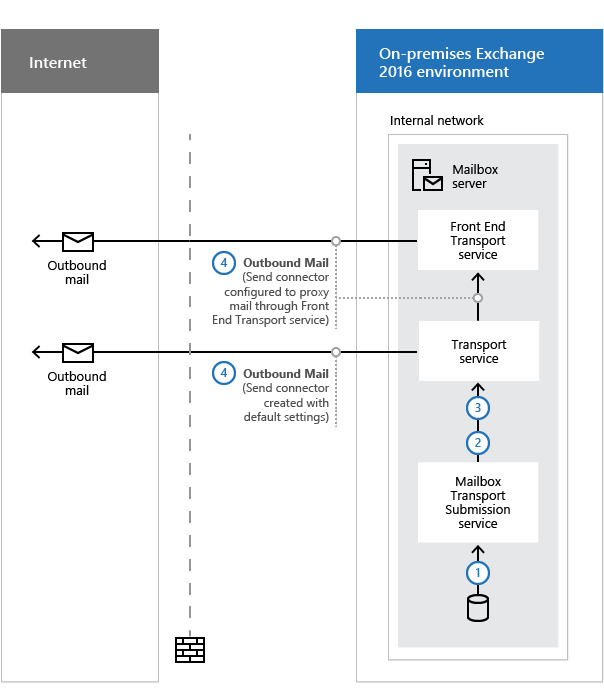 - 出站代理:传输服务使用创建的发送连接器将邮件发送到本地邮箱服务器或远程邮箱服务器上的前端传输服务。 在前端传输服务中,名为“出站代理前端 <邮箱服务器名称>”的默认接收连接器接受邮件。 前端传输服务将邮件发送到 Internet。