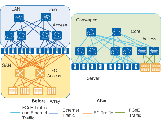 数据中心网络融合后,存储网络SAN和以太网LAN通过网络融合技术可共享同一个单一的、集成的网络基础设施,解决了不同类型网络共存所带来的问题,实现了网络基础设施整合、精简的目标。